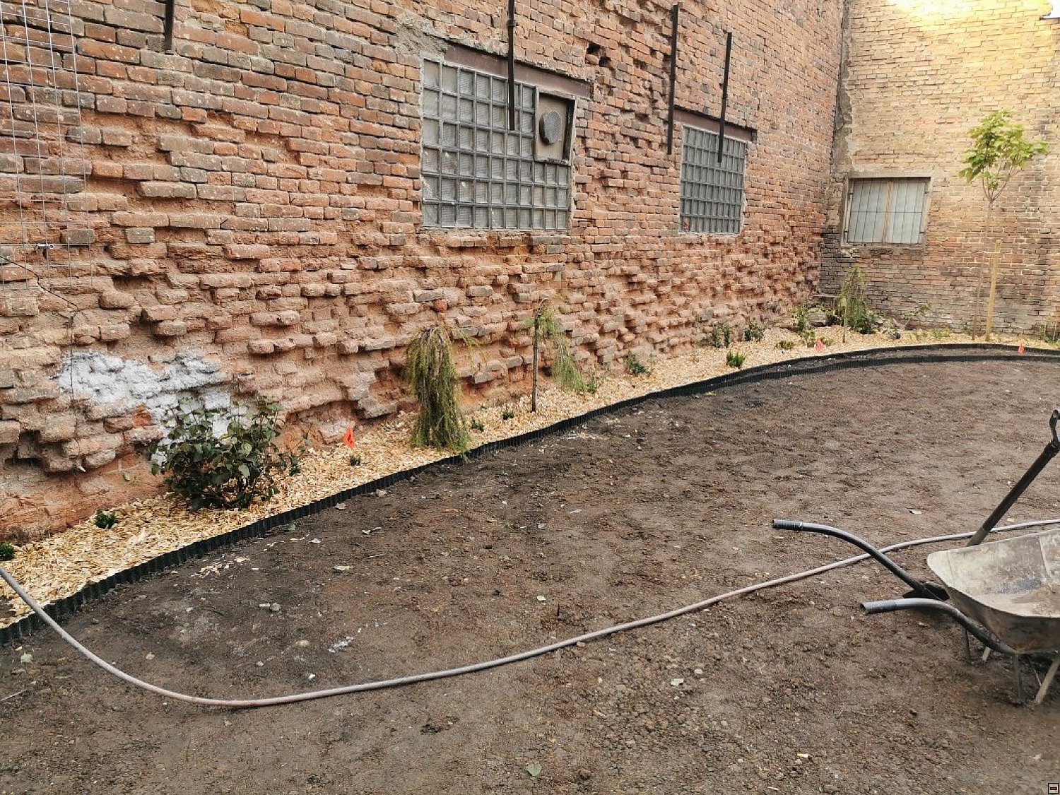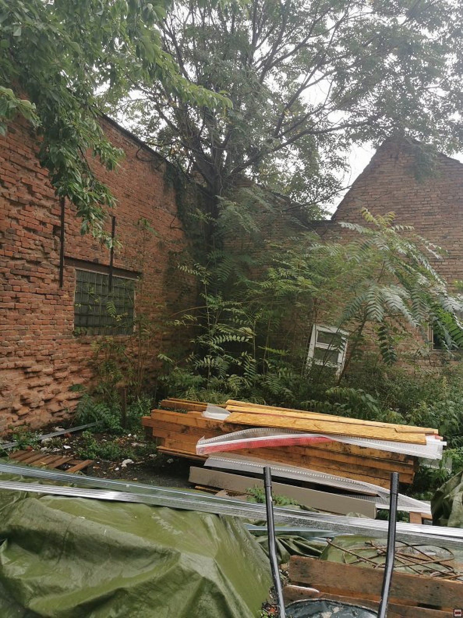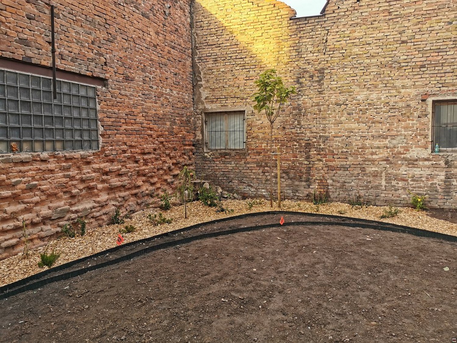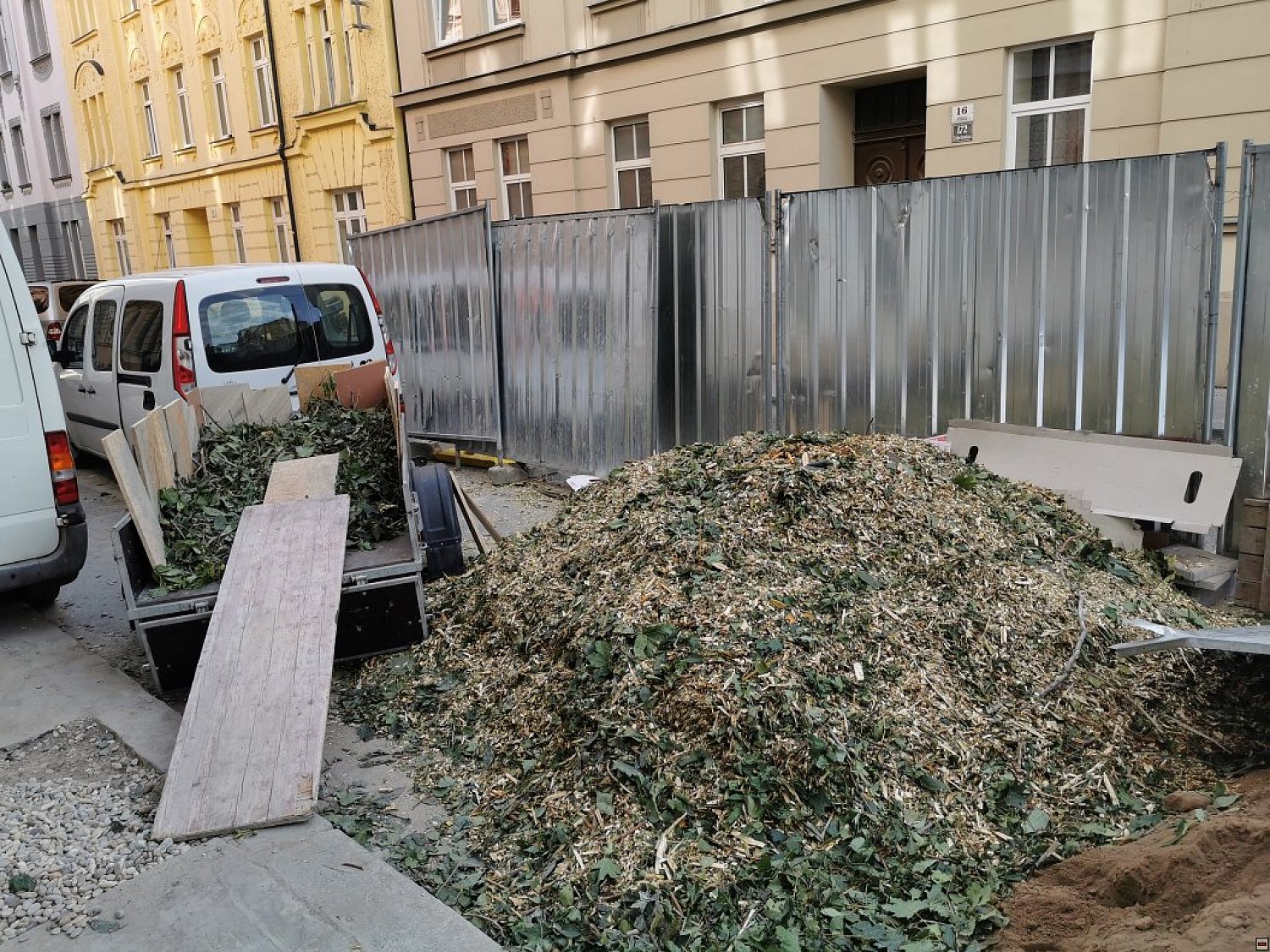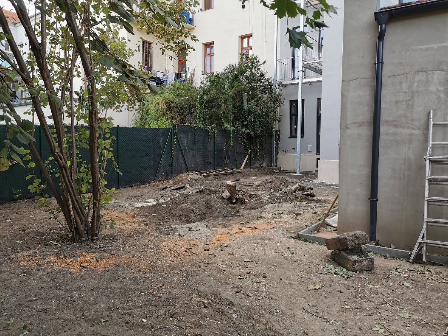 Prostor uvnitř bloku bytového domu byl plný vzrostlých náletových dřevin, místo hlíny směs stavební suti, nepořádku a odpadků. Z tohoto zdevastovaného prostoru jsme měli vytvořit odpočinkovou zahradu.
