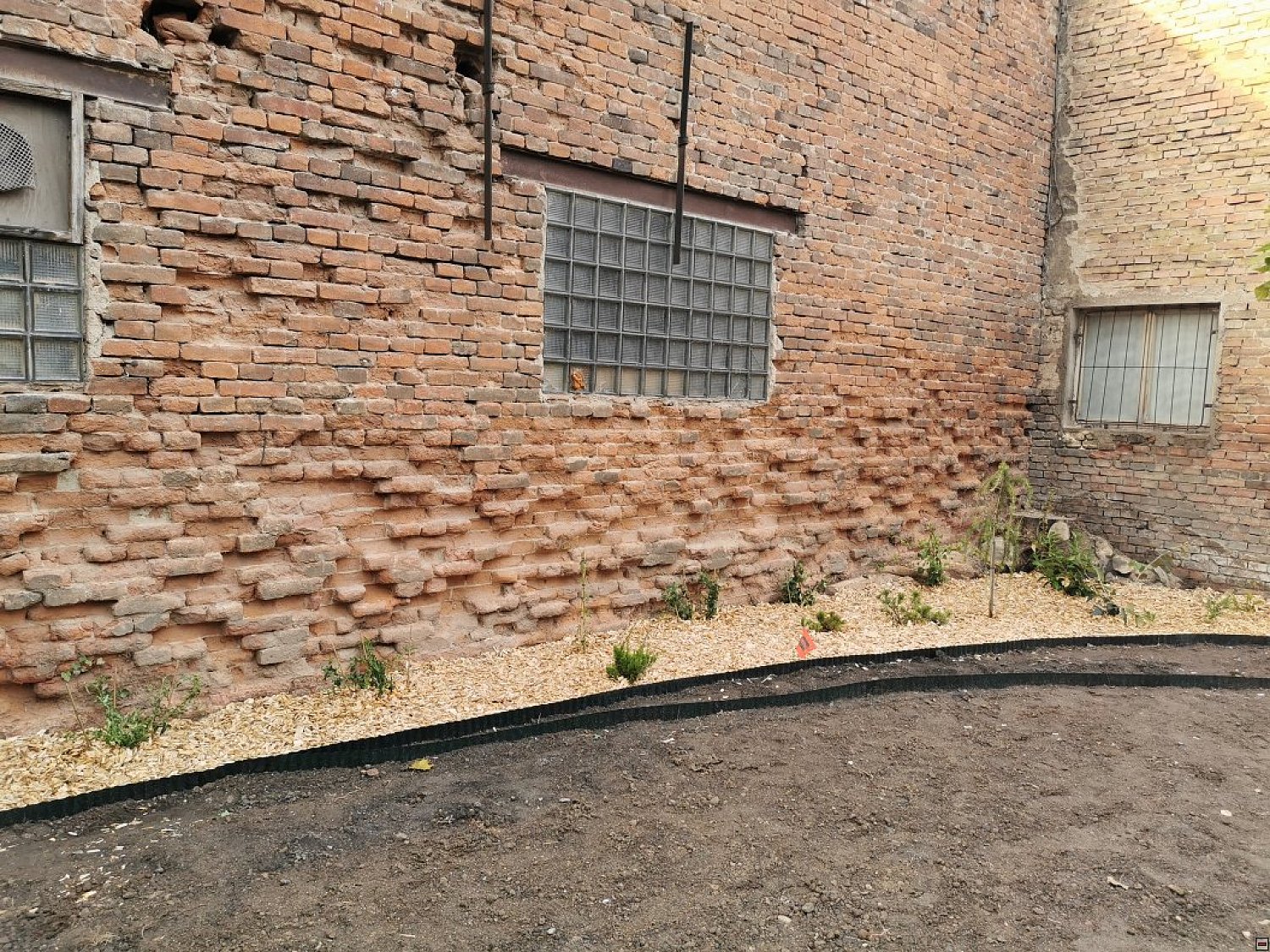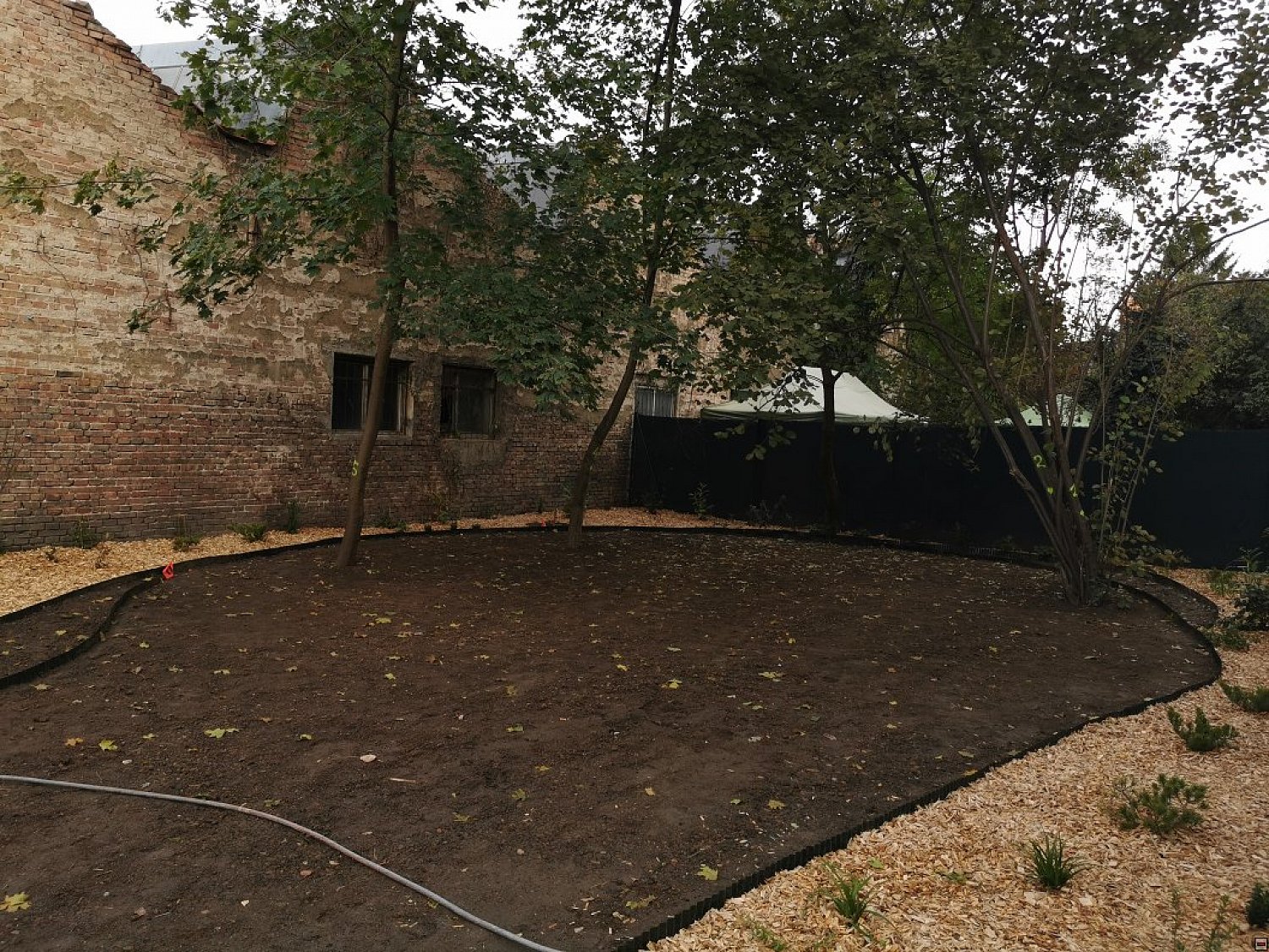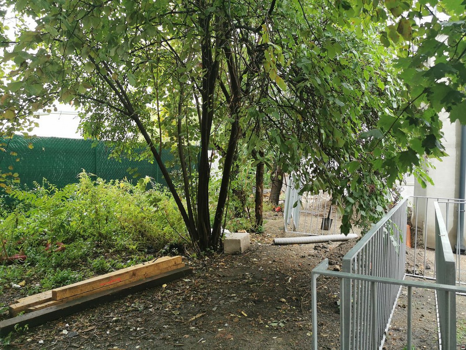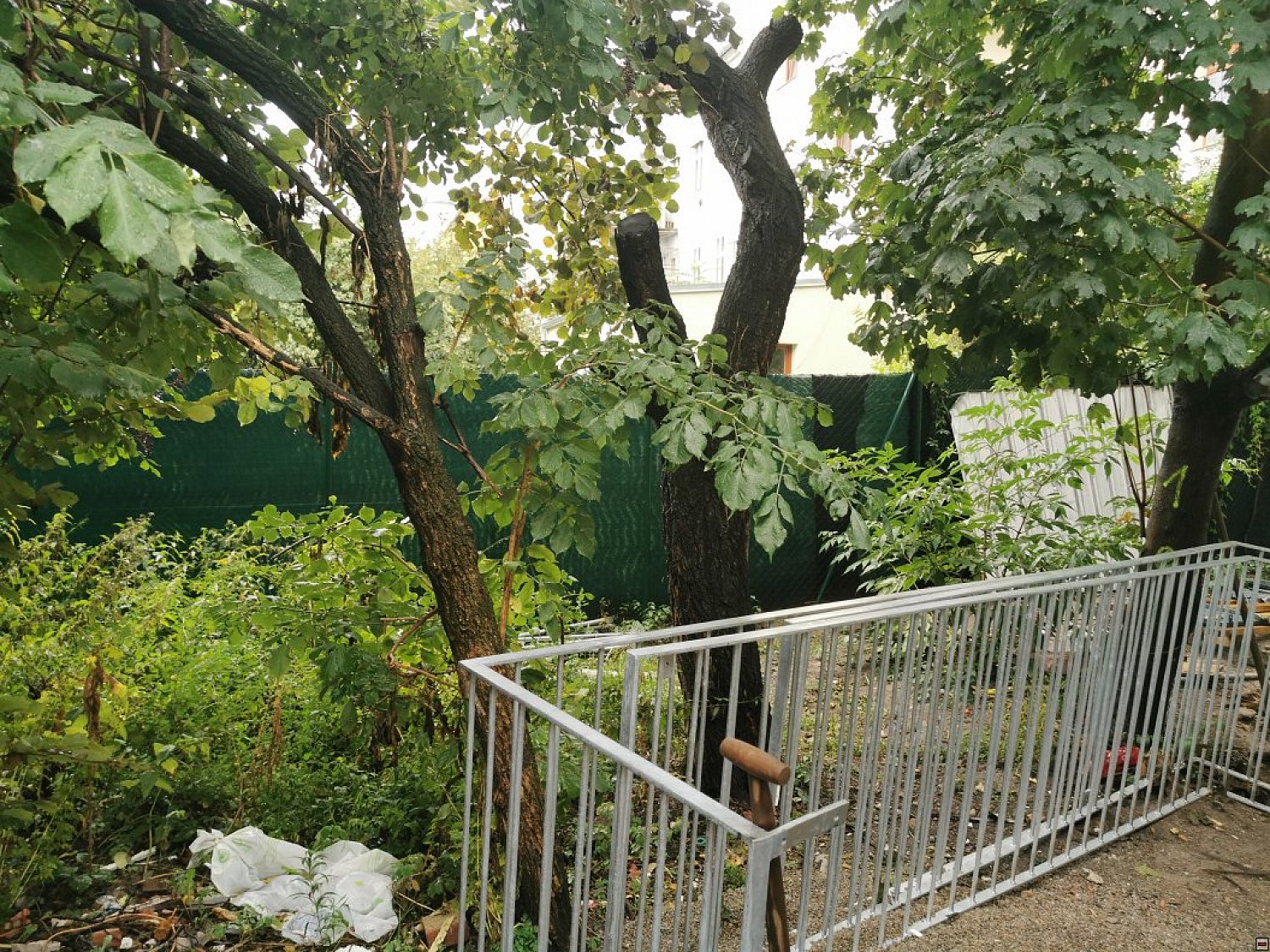 Prostor uvnitř bloku bytového domu byl plný vzrostlých náletových dřevin, místo hlíny směs stavební suti, nepořádku a odpadků. Z tohoto zdevastovaného prostoru jsme měli vytvořit odpočinkovou zahradu.