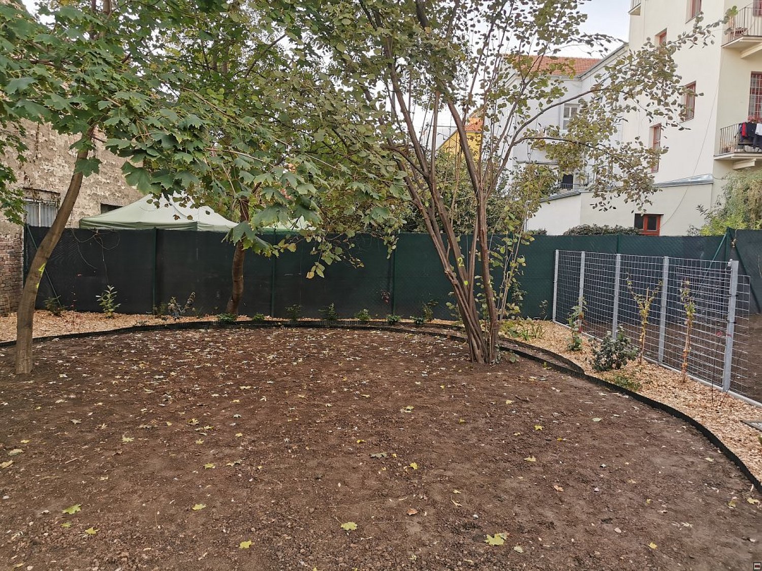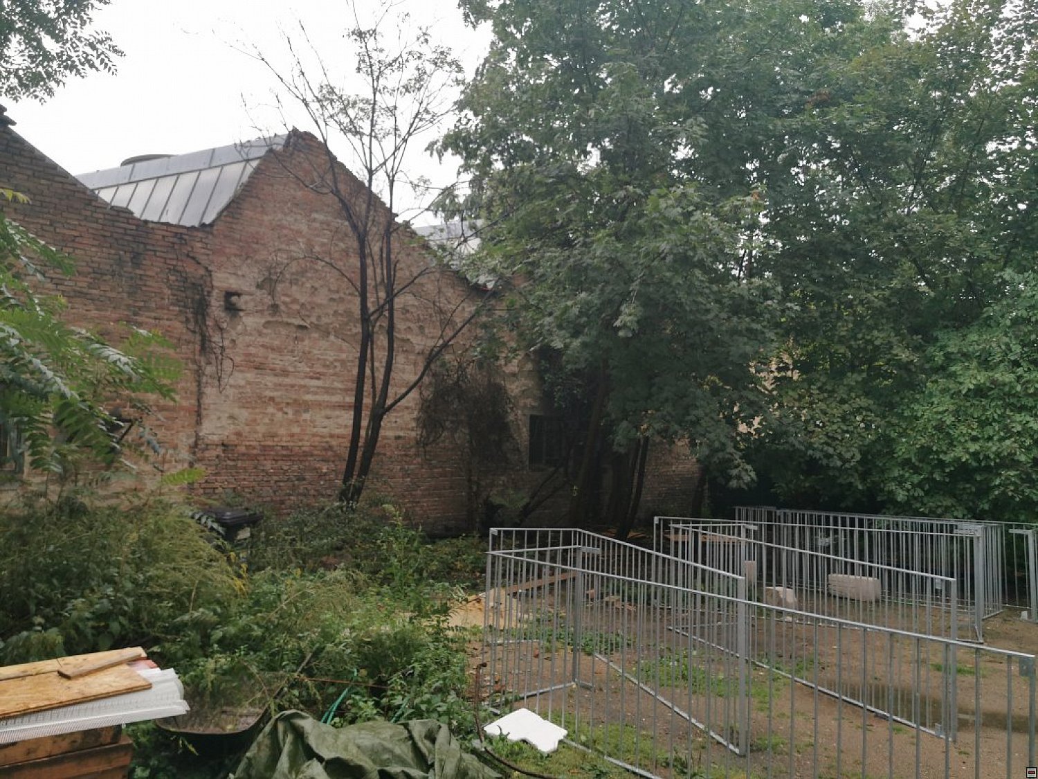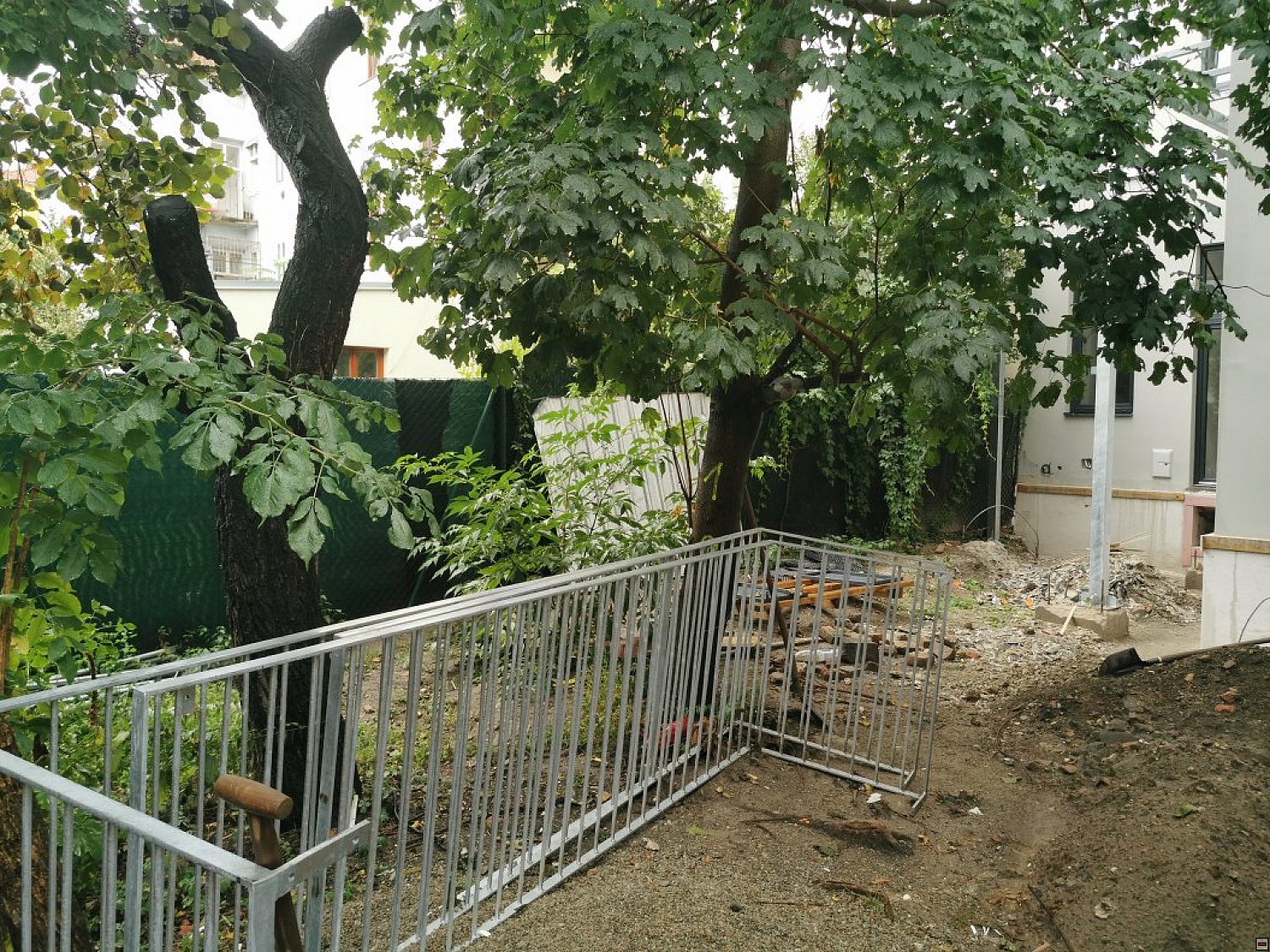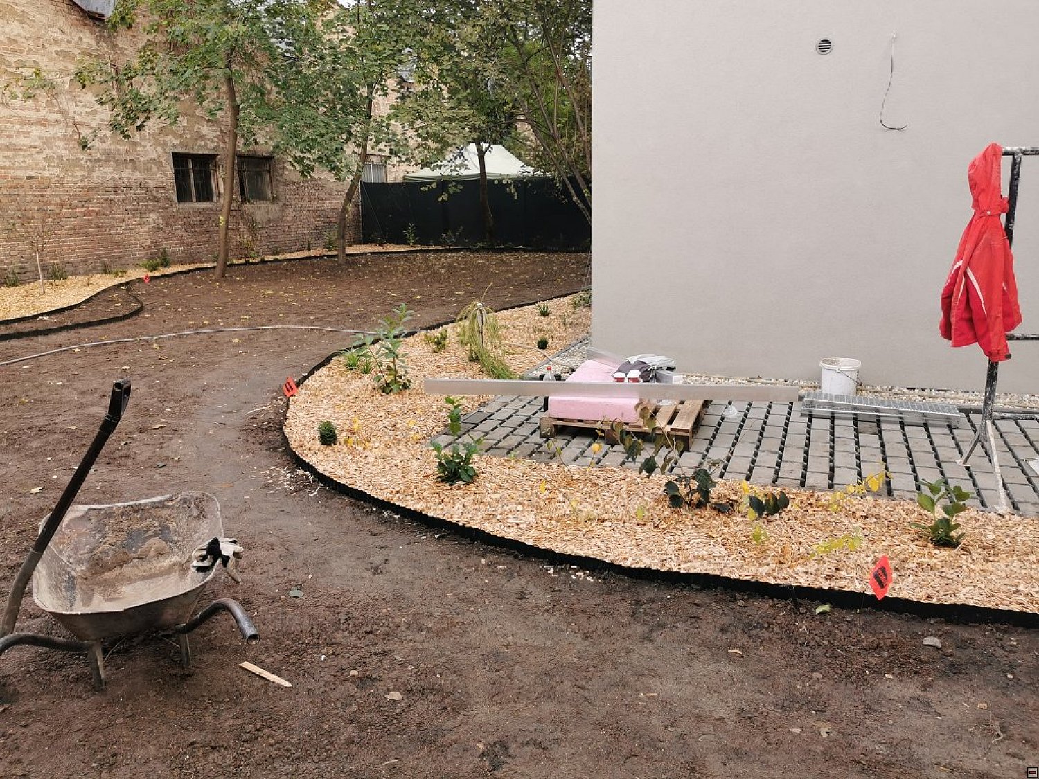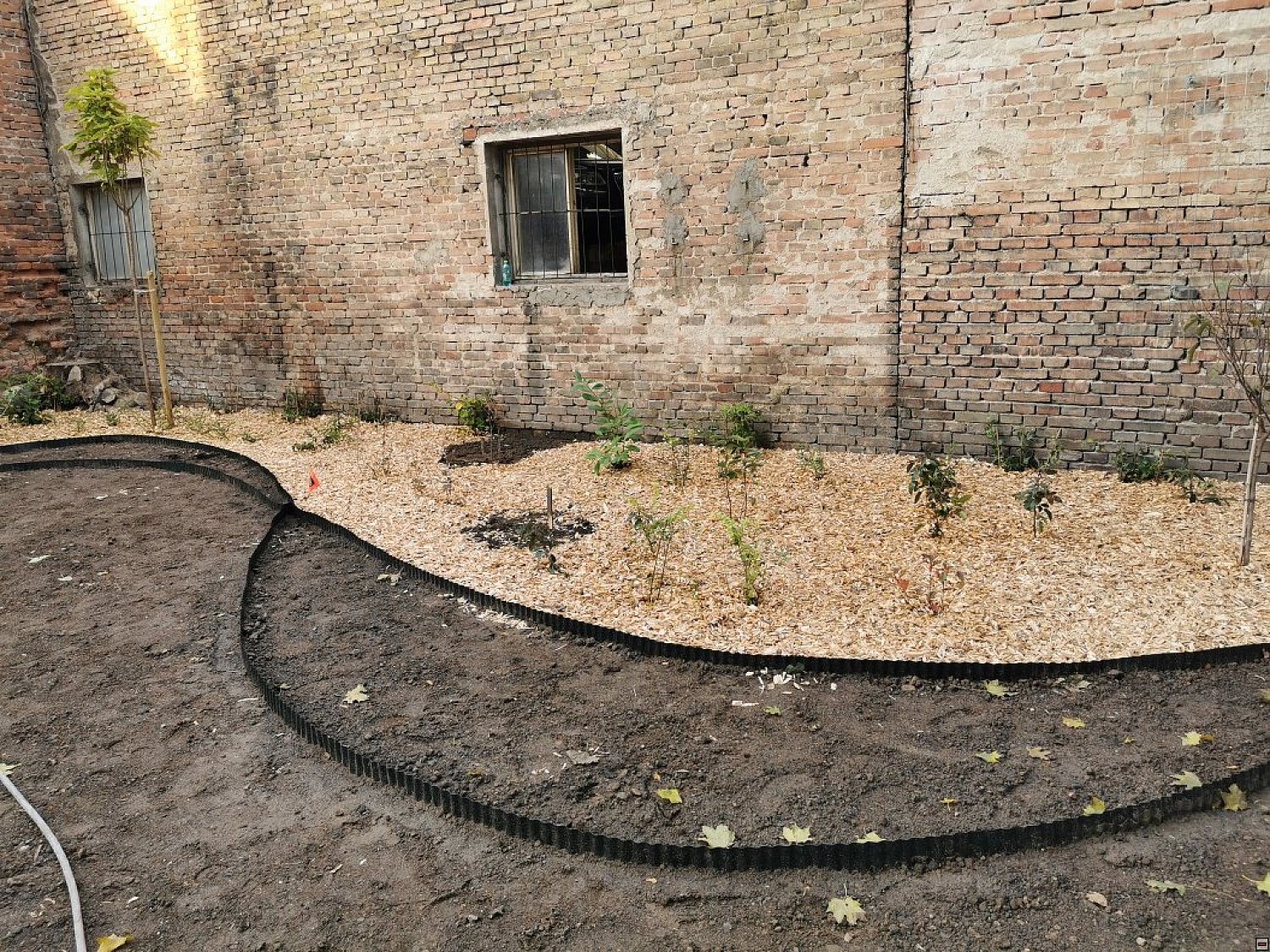 Prostor uvnitř bloku bytového domu byl plný vzrostlých náletových dřevin, místo hlíny směs stavební suti, nepořádku a odpadků. Z tohoto zdevastovaného prostoru jsme měli vytvořit odpočinkovou zahradu.