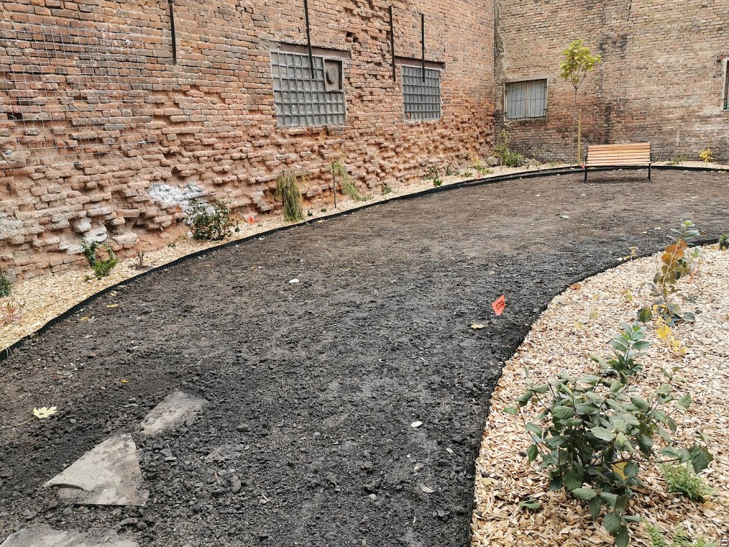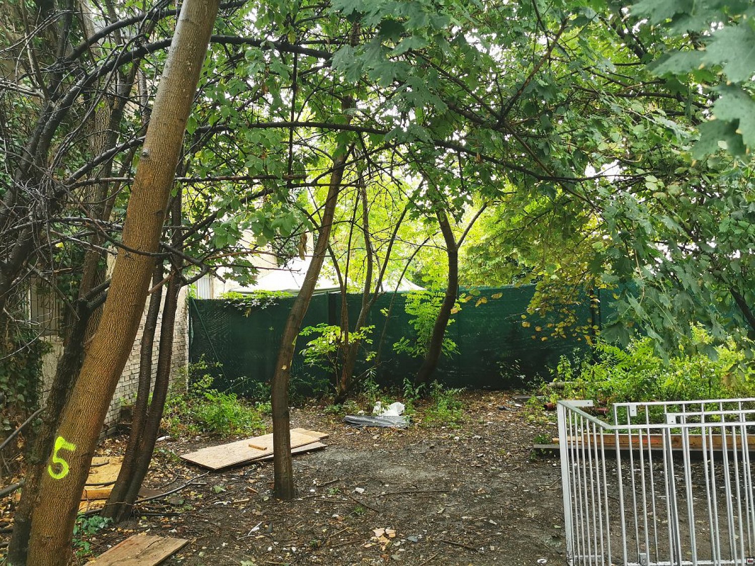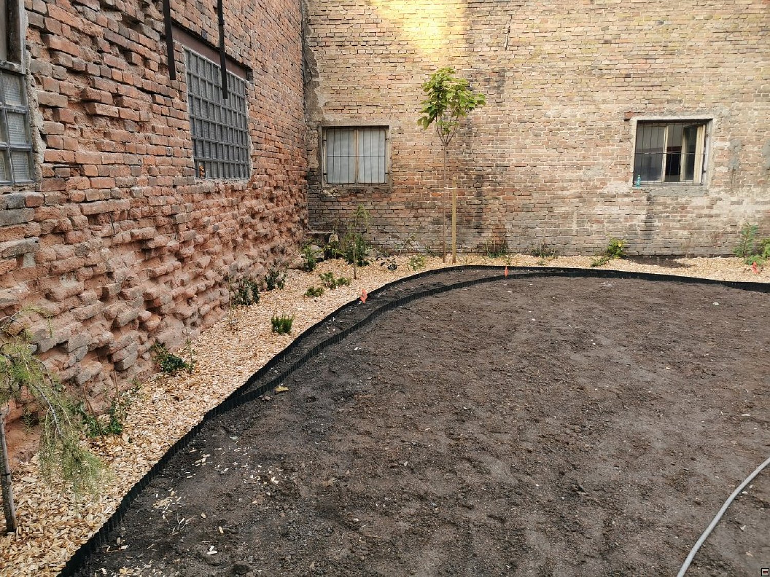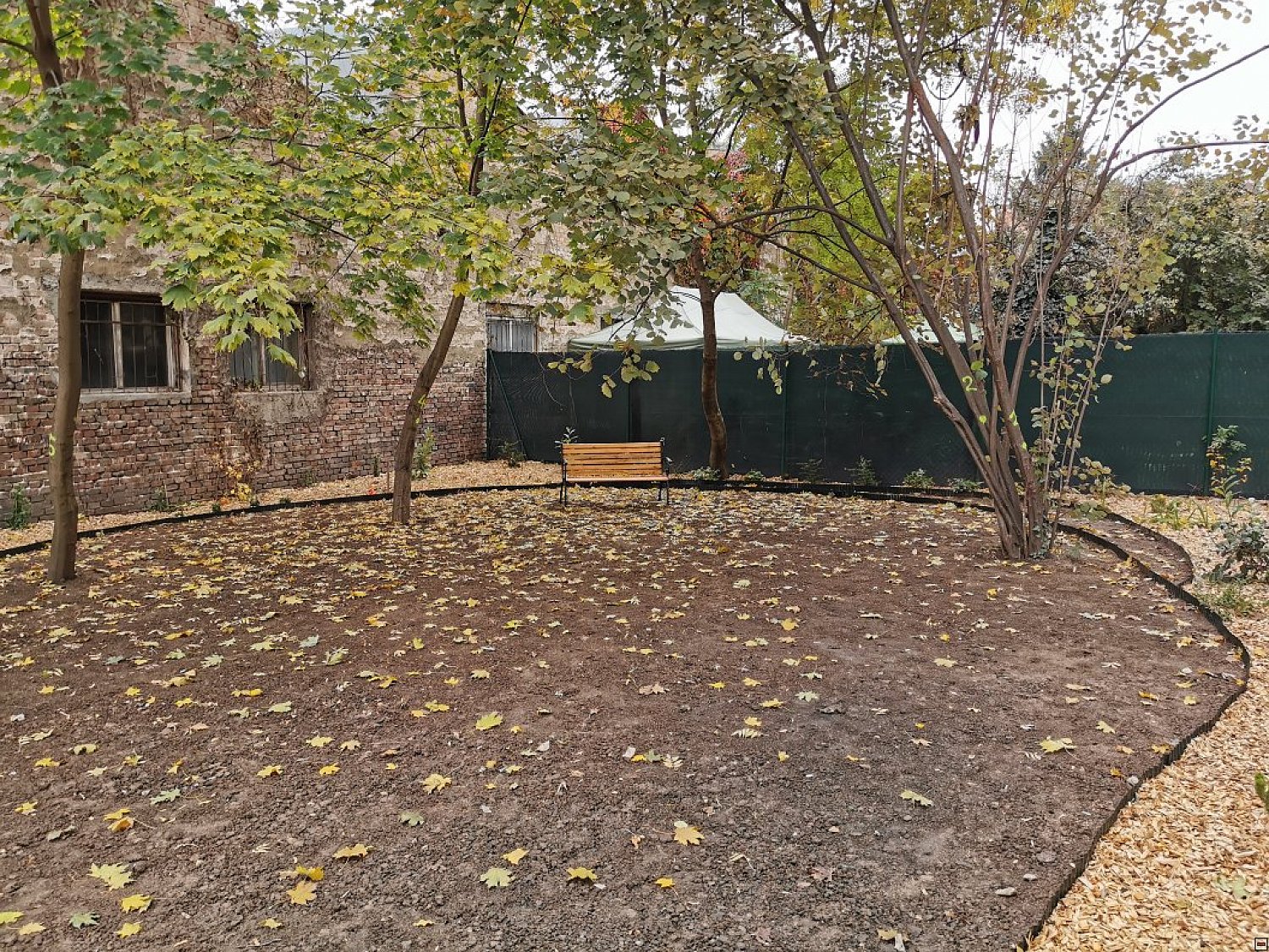 Prostor uvnitř bloku bytového domu byl plný vzrostlých náletových dřevin, místo hlíny směs stavební suti, nepořádku a odpadků. Z tohoto zdevastovaného prostoru jsme měli vytvořit odpočinkovou zahradu.